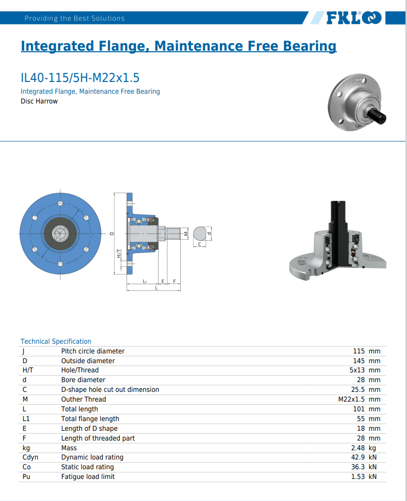 M22 x 145/115 x 101 mm - FKL Gewinde: M22 x 1,5 mm Lochkreis: J = 115 mm Lochgröße: H/T = 5 x 13 mm Gesamt Ø: D = 145 mm